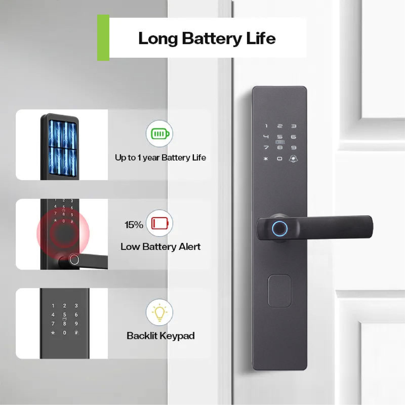 A sleek waterproof smart lock with fingerprint, RFID, password, and Tuya app control, designed for secure, modern access and easy management for homes or offices.