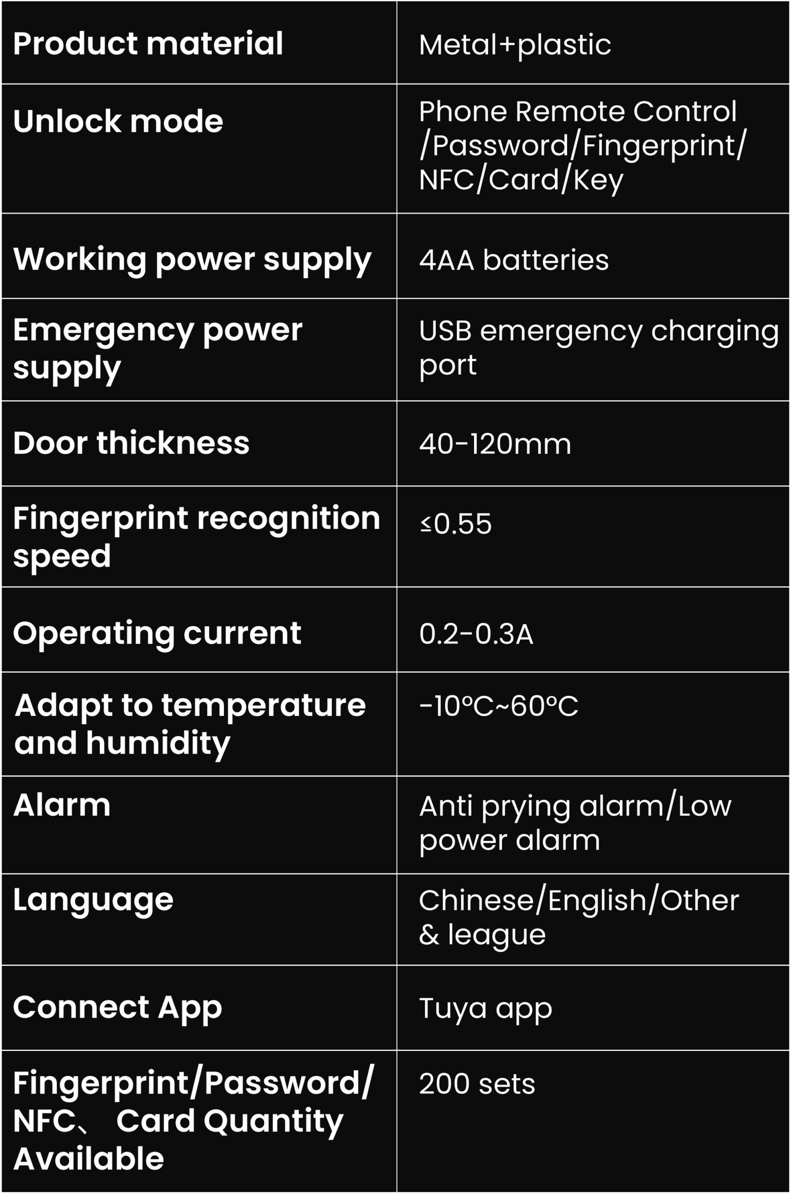 Fingerprint/Password/NFC、Card Quantity Available